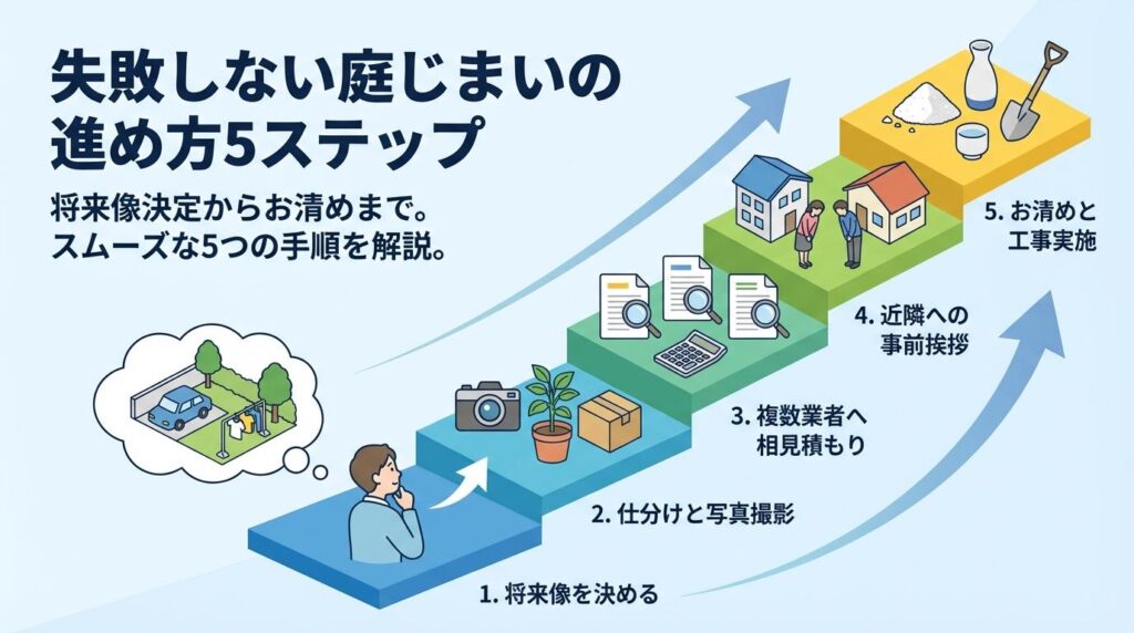 「よし、庭じまいをしよう!」と決めても、何から手をつければいいか迷ってしまいますよね。 私たちグリーンデザイナーズがいつもお客様にご案内している、スムーズな進め方をご紹介します。