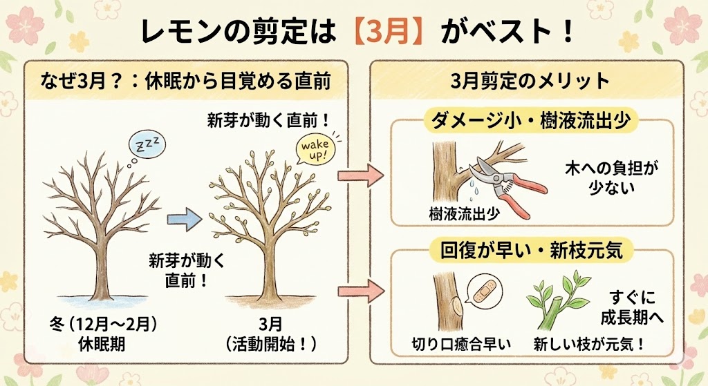 レモンの剪定に最も適した時期は、本格的に暖かくなる前の3月です。地域によって多少のずれはありますが、春の新芽が動き出す直前のこのタイミングが、木への負担が最も少ないベストシーズンです。