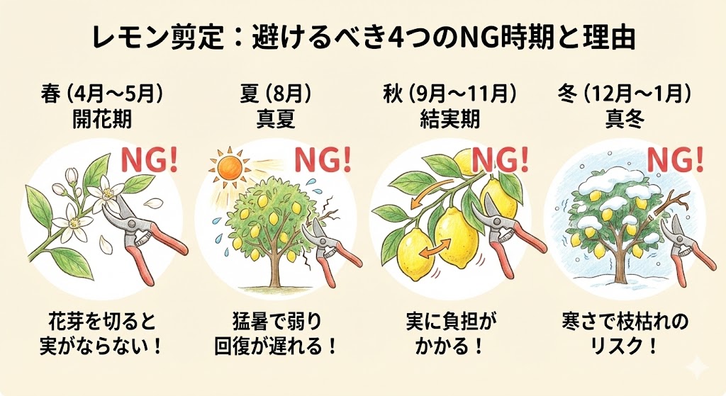 以下の時期は、レモンの木の成長サイクルにおいて重要な期間であり、剪定は原則として避けるべきです。