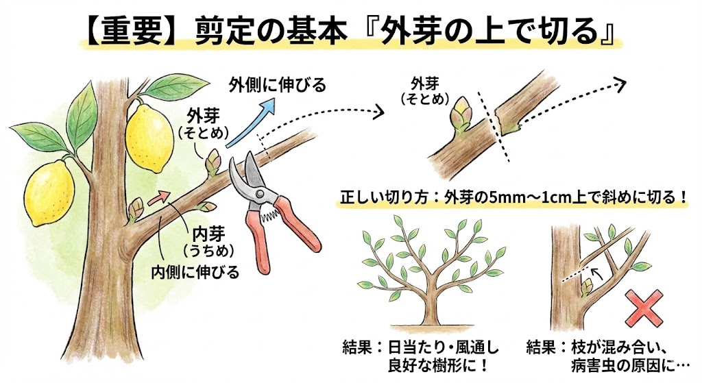 - 基本の切り方:必ず「外芽の上」で切る。