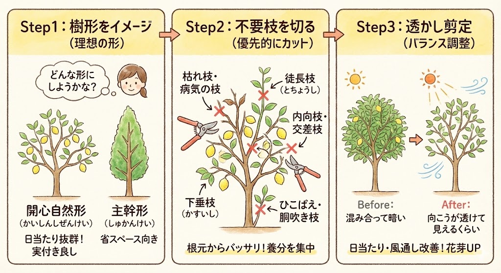 - 剪定の手順:①樹形をイメージ → ②不要枝の除去 → ③透かし剪定