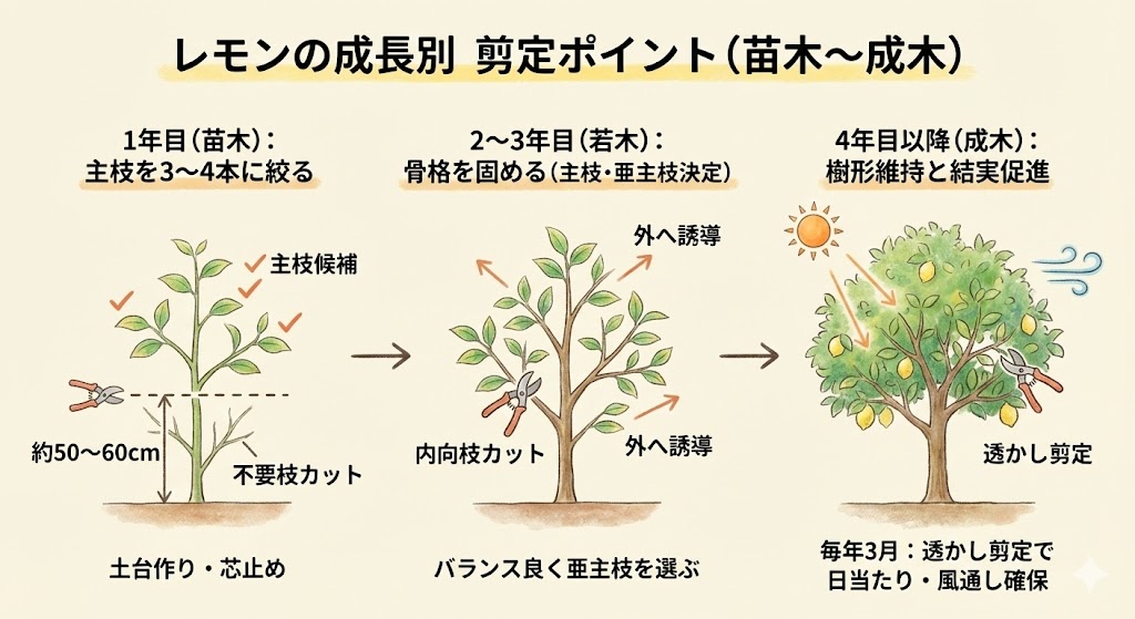 レモンの木は、樹齢によって剪定の目的が変わります。それぞれの成長ステージに合わせた剪定を行うことで、より健康で実付きの良い木に育てることができます。