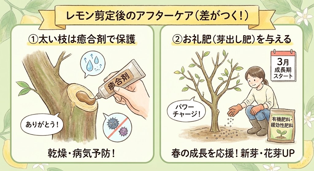- 剪定後のケア:太い枝の切り口に癒合剤を塗り、お礼肥を与える。