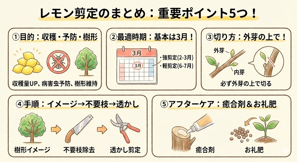 今回は、レモンの剪定について、目的から時期、具体的な方法、アフターケアまで詳しく解説しました。最後に、重要なポイントを振り返りましょう。