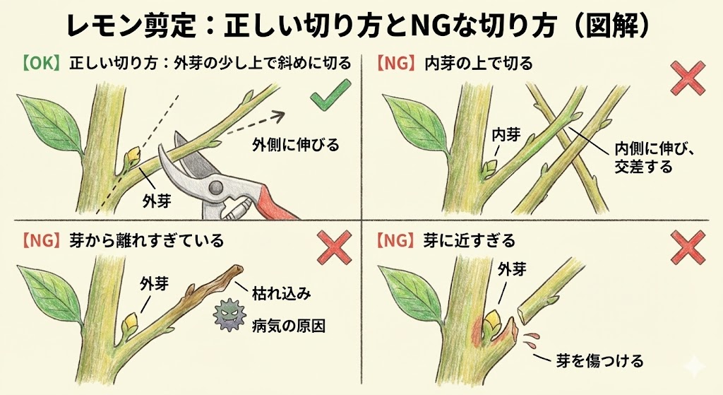 - 【NG】内芽の上で切る:新しい枝が内側に向かって伸び、他の枝と交差して風通しが悪くなる原因に。
