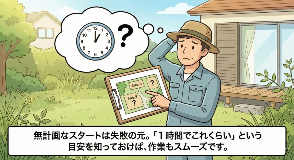 「手強い草」が多い場合は、予定時間の1.5倍〜2倍を見積もっておきましょう。