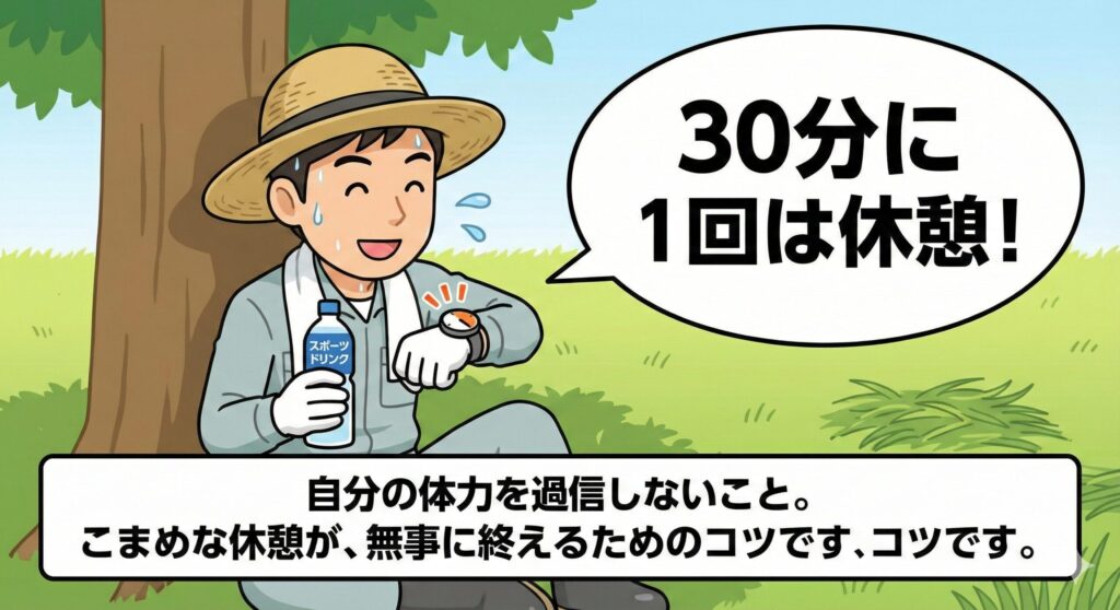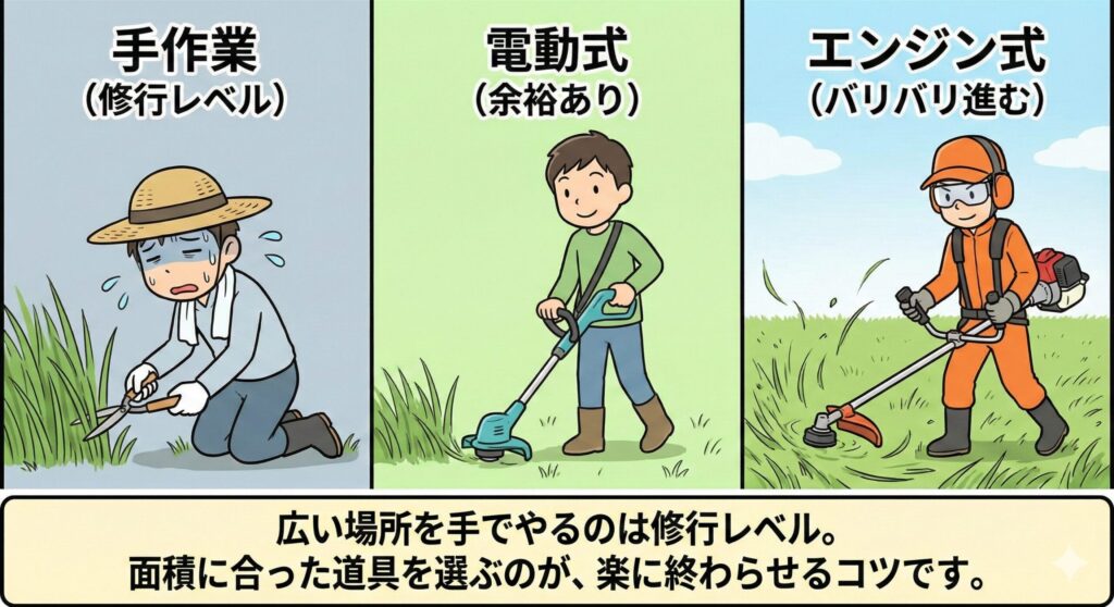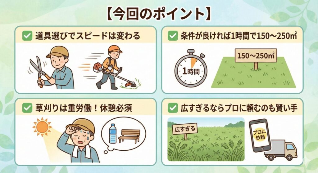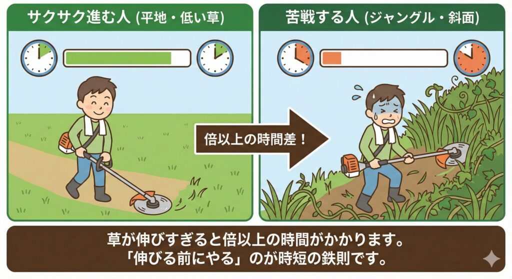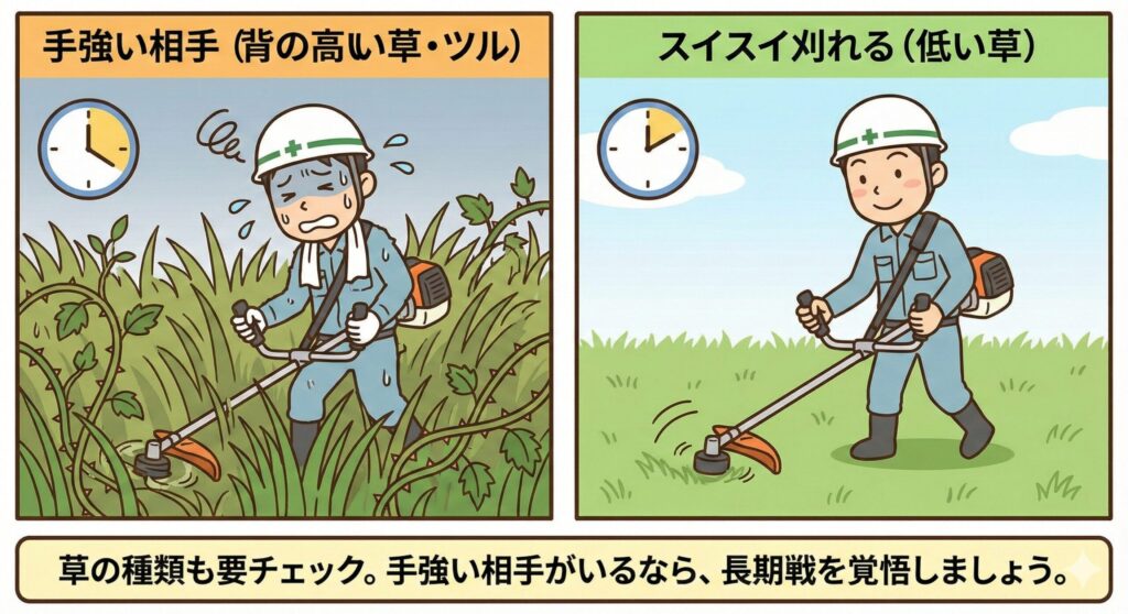 そうならないためには、始める前に「どれくらいの広さを、何時間で刈れるか」の目安を知っておくことが大切です。