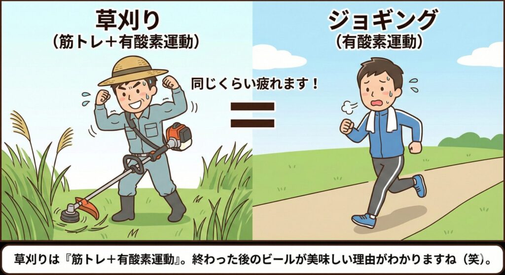 • 電動草刈り機:約300〜400kcal(ジョギング30〜40分相当)
