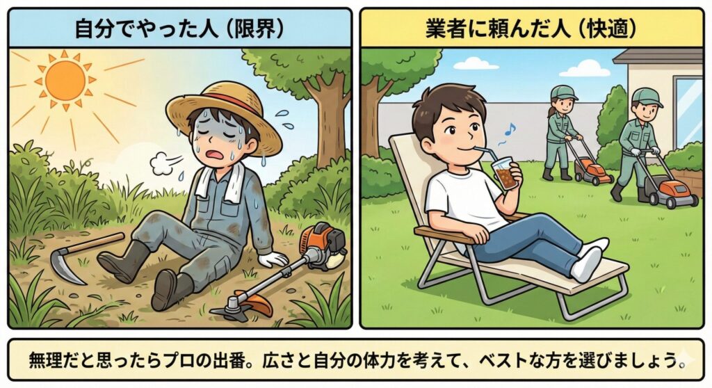 庭の草刈り、業者に頼む?自分でやる?判断基準と費用・手間の比較