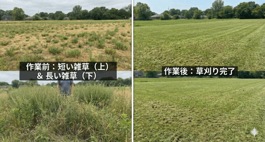 この価格は、草の長さや密度、斜面があるかどうかで変わってきます。 「草が伸び放題だと高くなる」と覚えておきましょう☝️