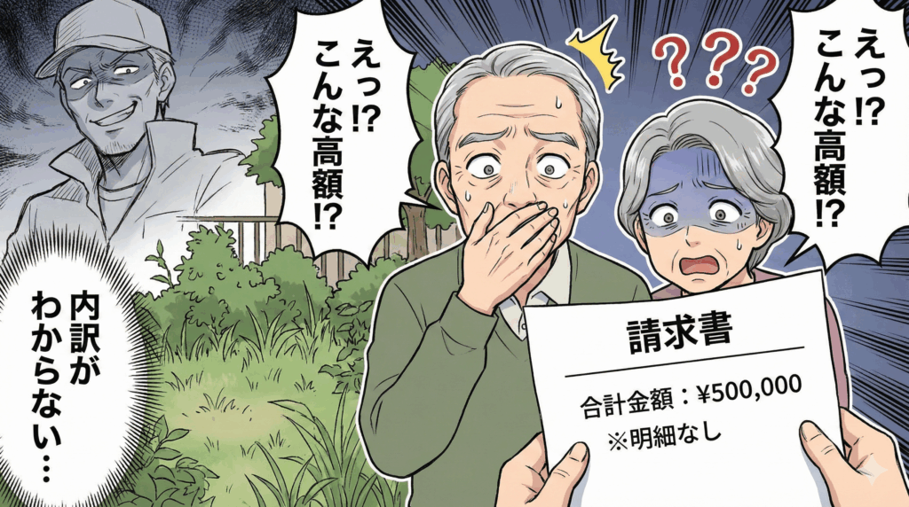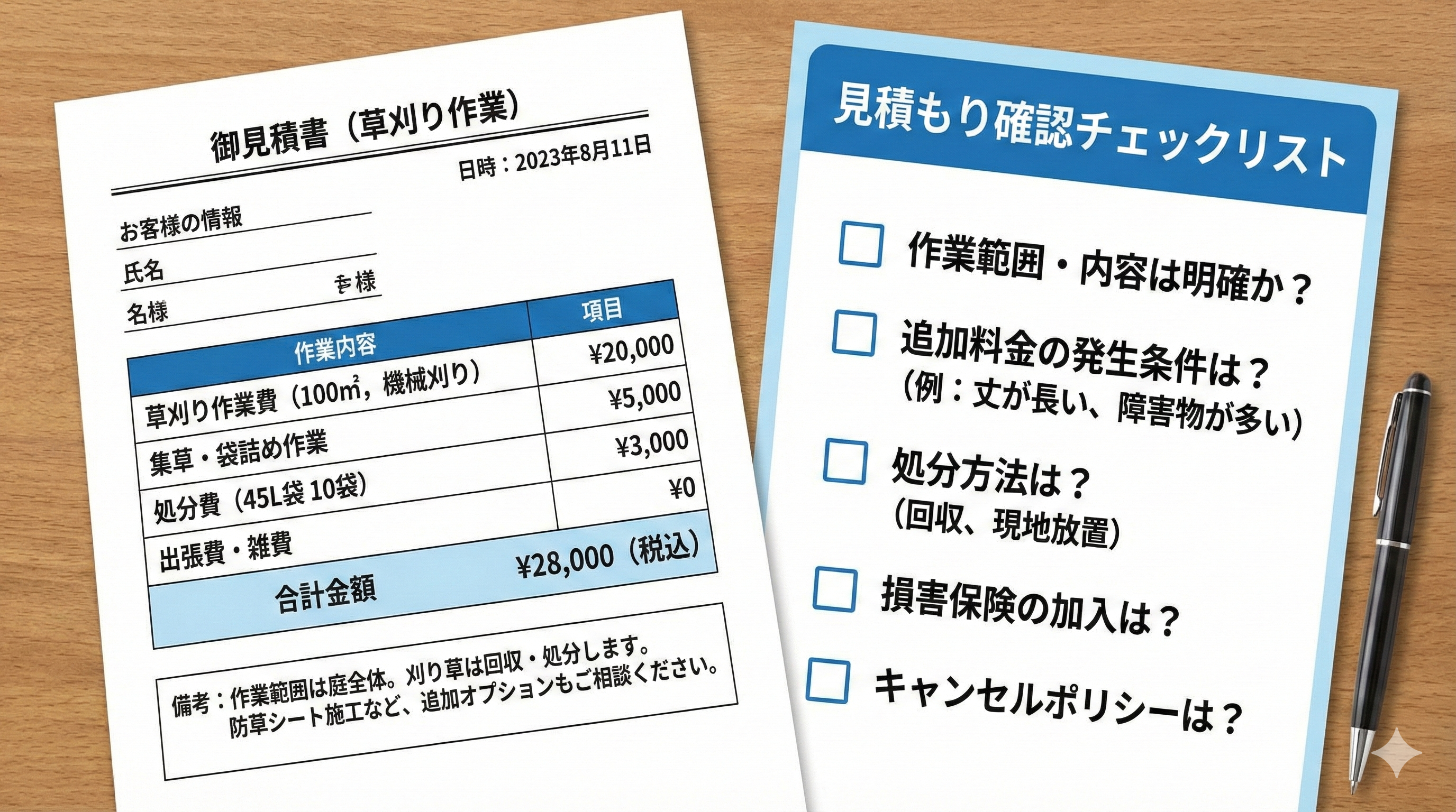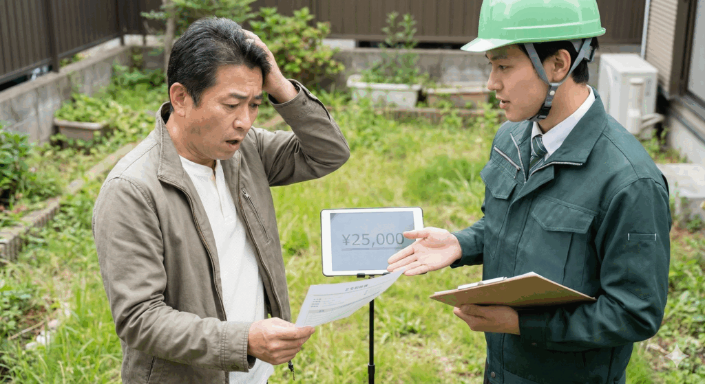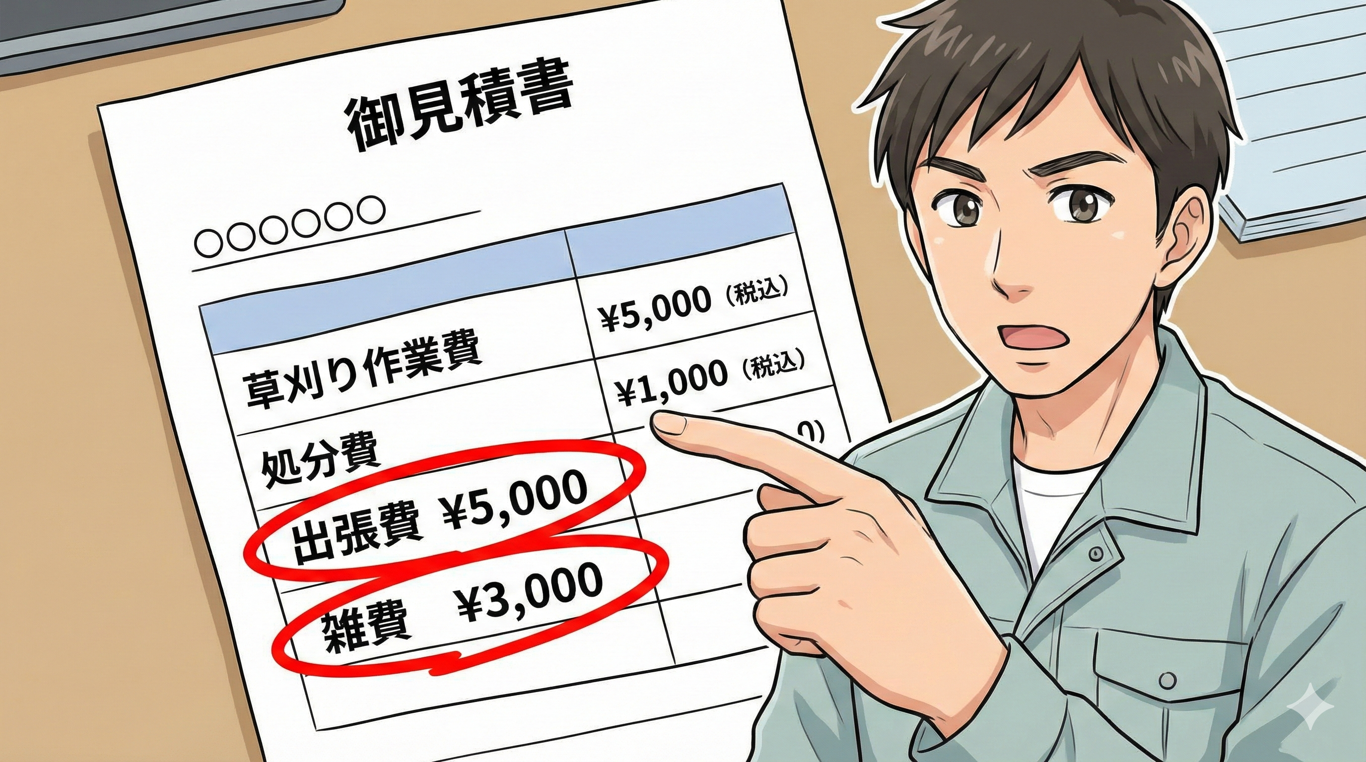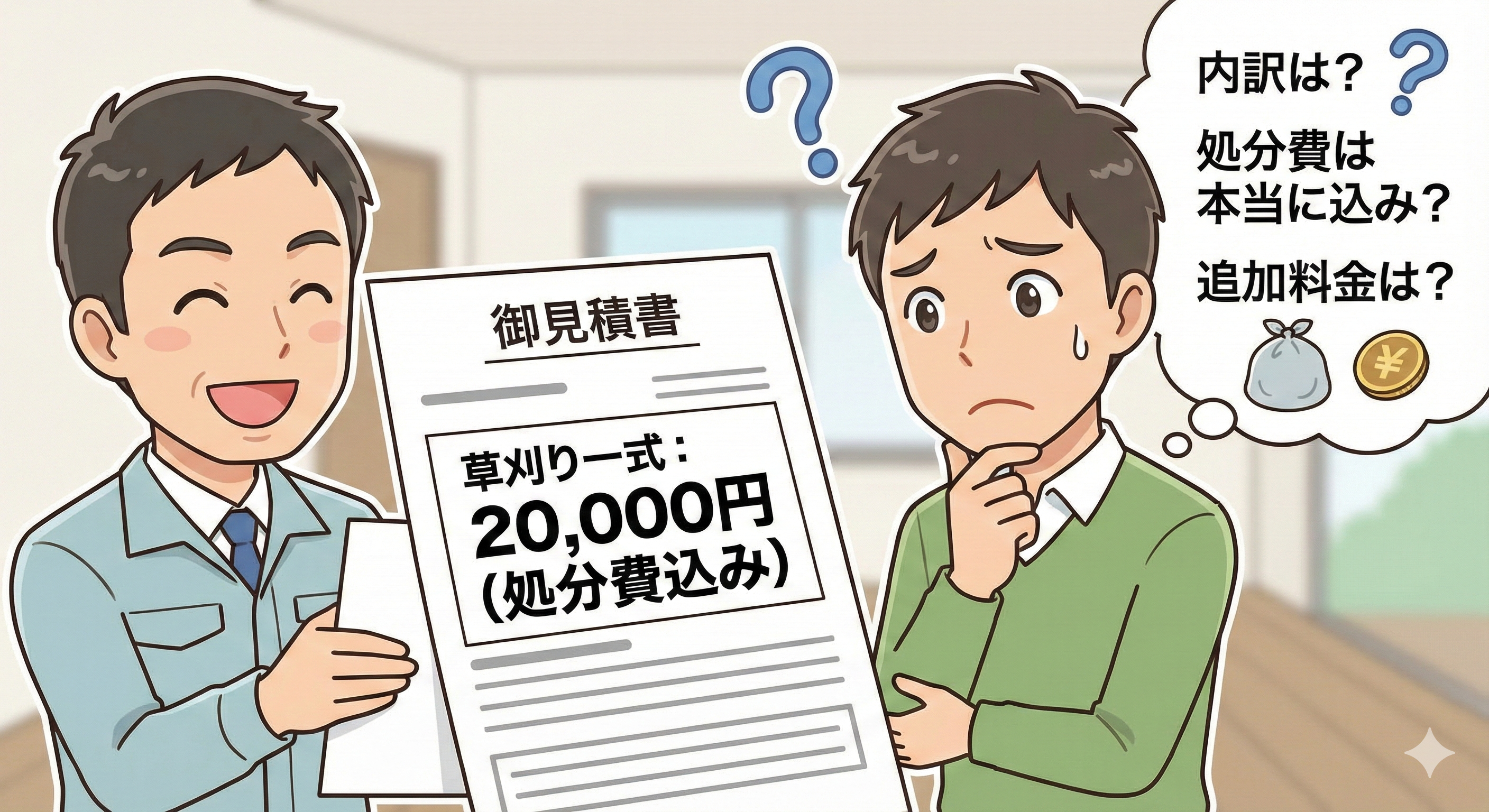 これ、一番多いトラブルです。 「見積もり1万円って書いてあるから頼んだのに、最後に刈草の処理代で5,000円追加された…」なんてことにならないように、「刈草の処分費は含まれていますか?」と必ず確認しましょう🗑️