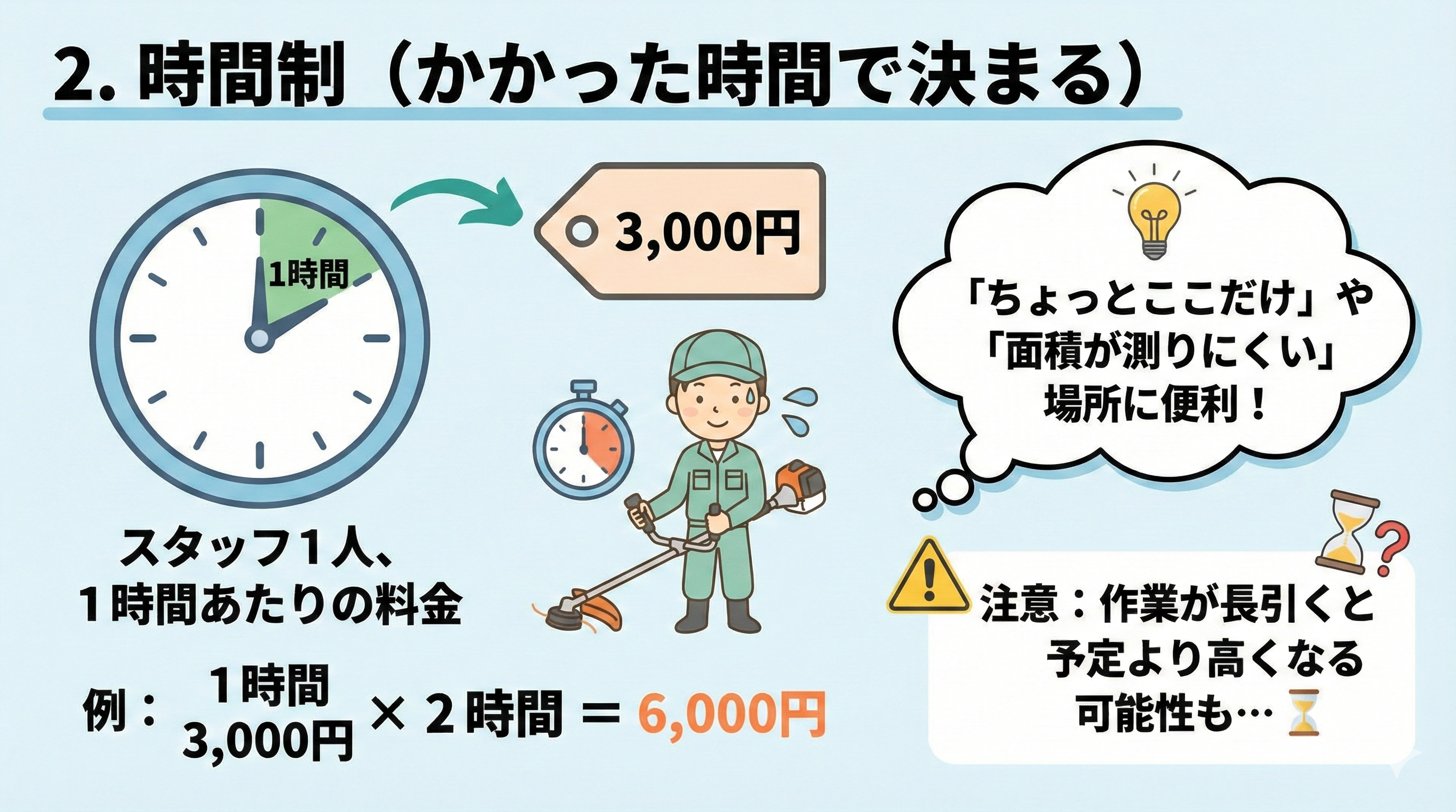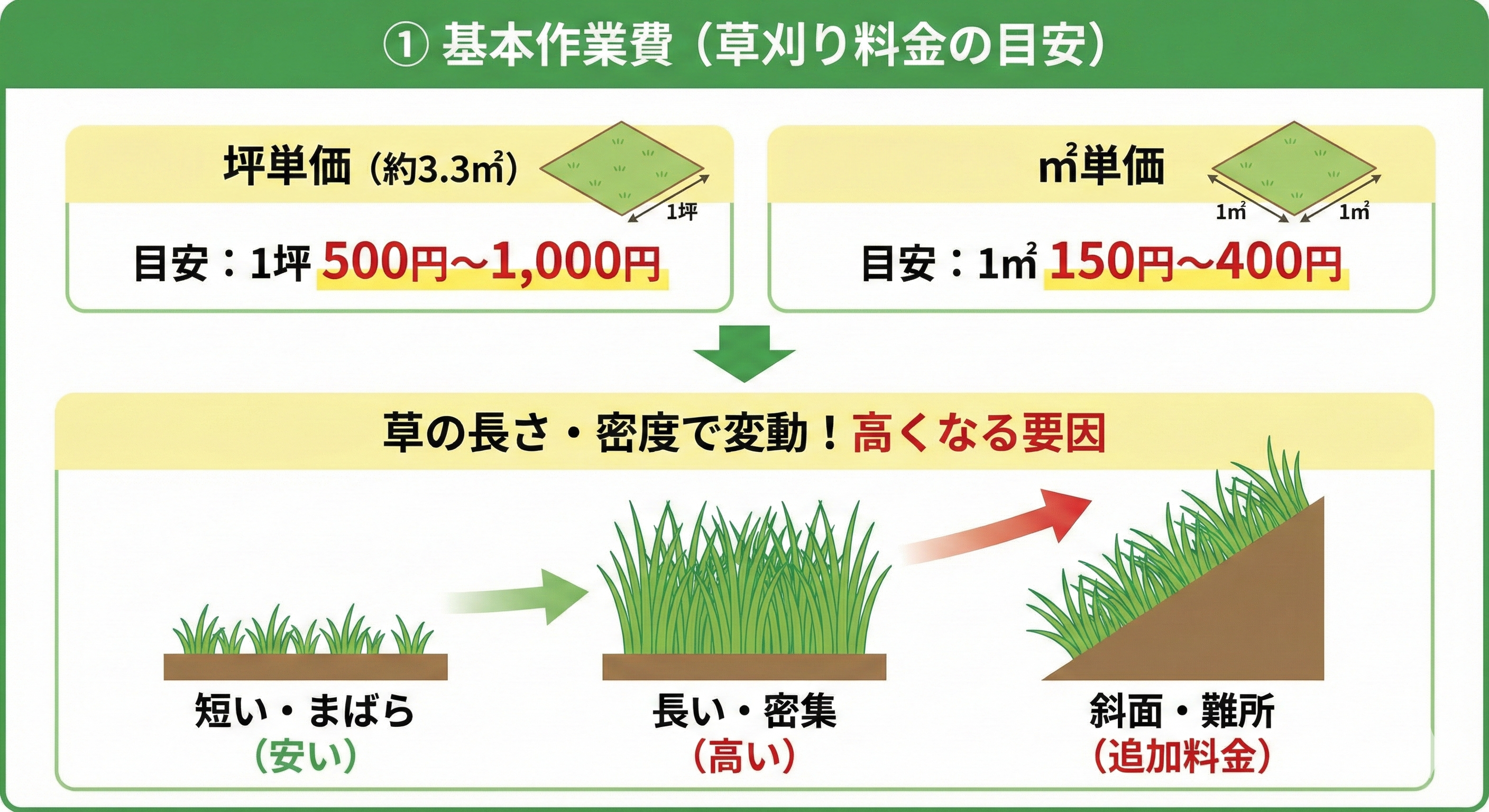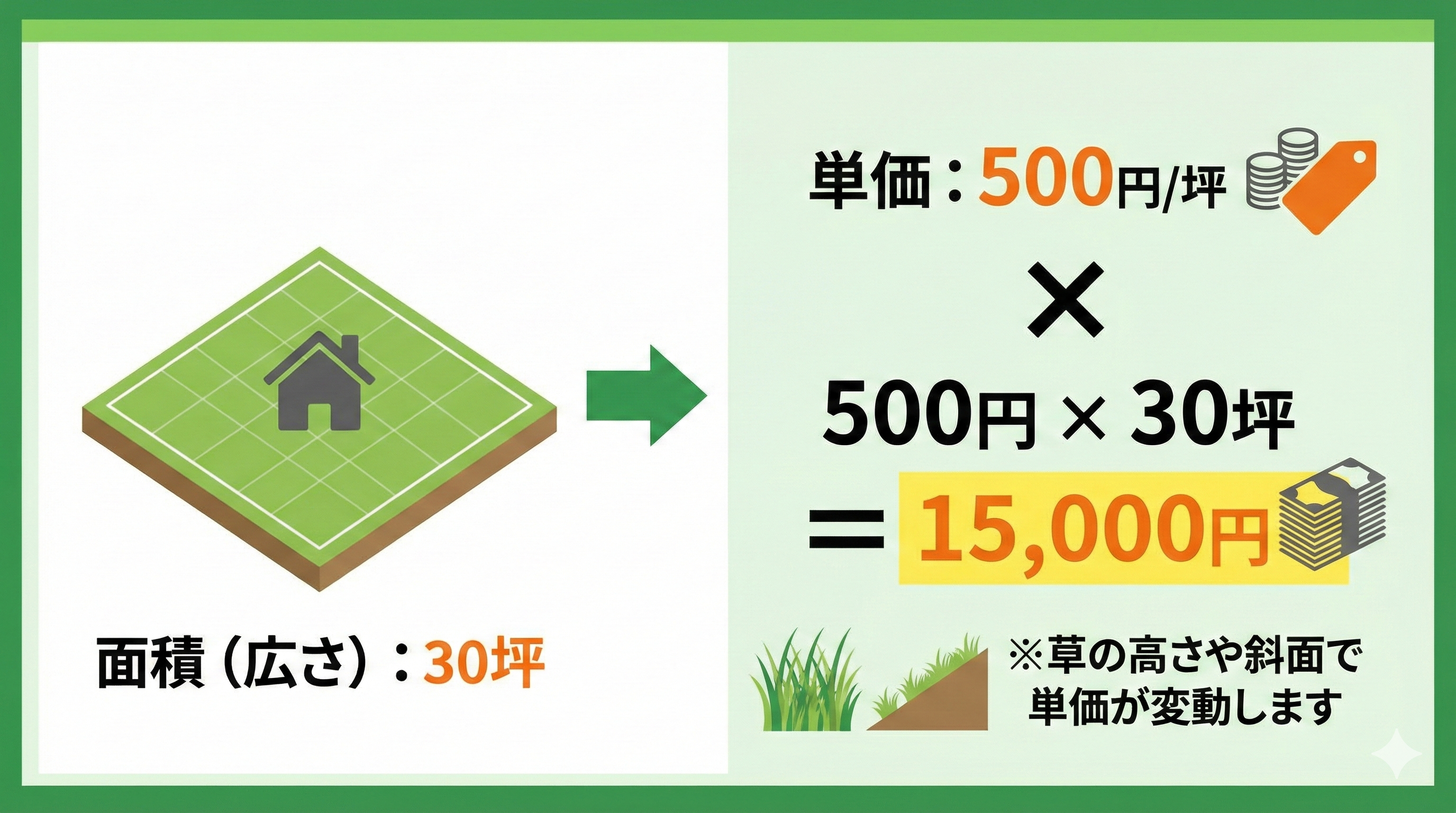ただし、草の高さや斜面の有無で単価が変わることがあるので、「うちは1坪いくらになる?」と確認が必要です。