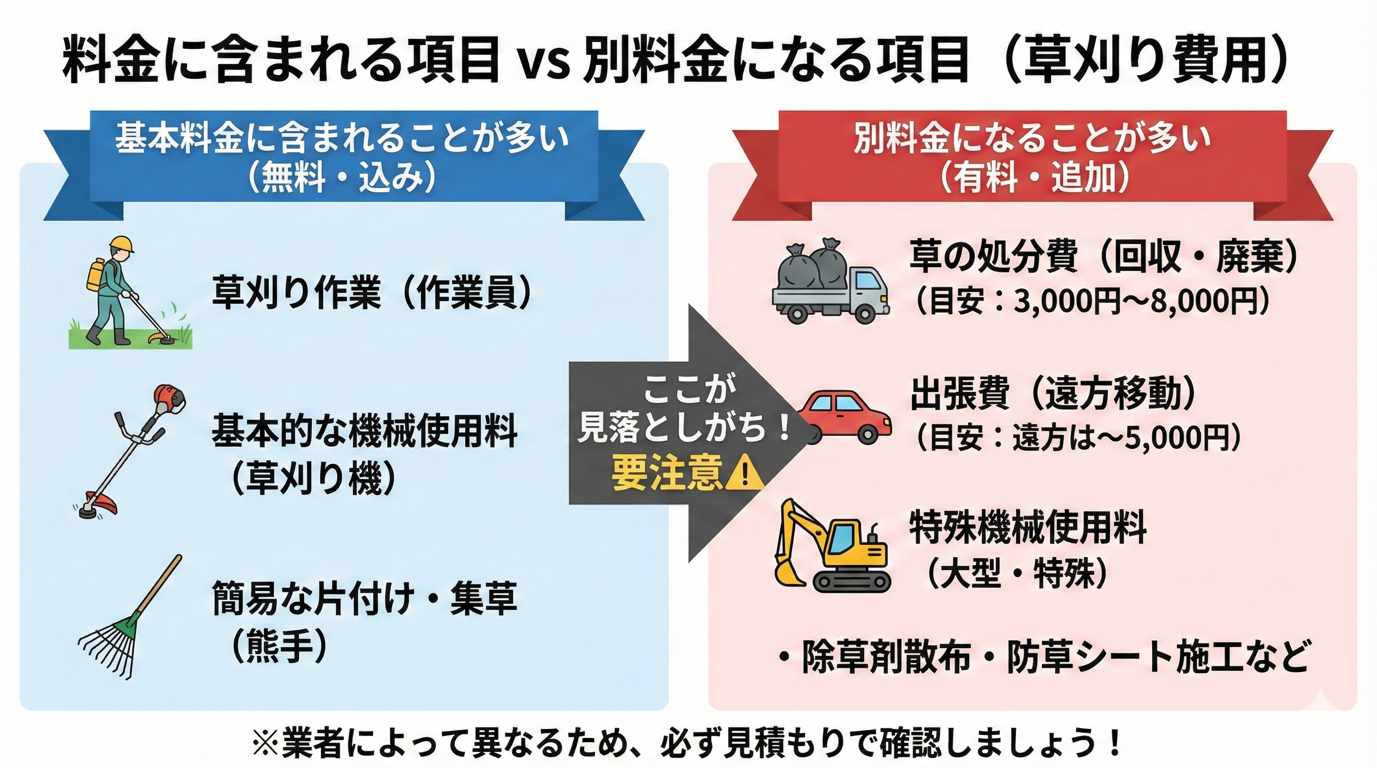 ここが見落としがち!草を刈るだけじゃなくて、片付けや移動にもお金がかかる場合があります。