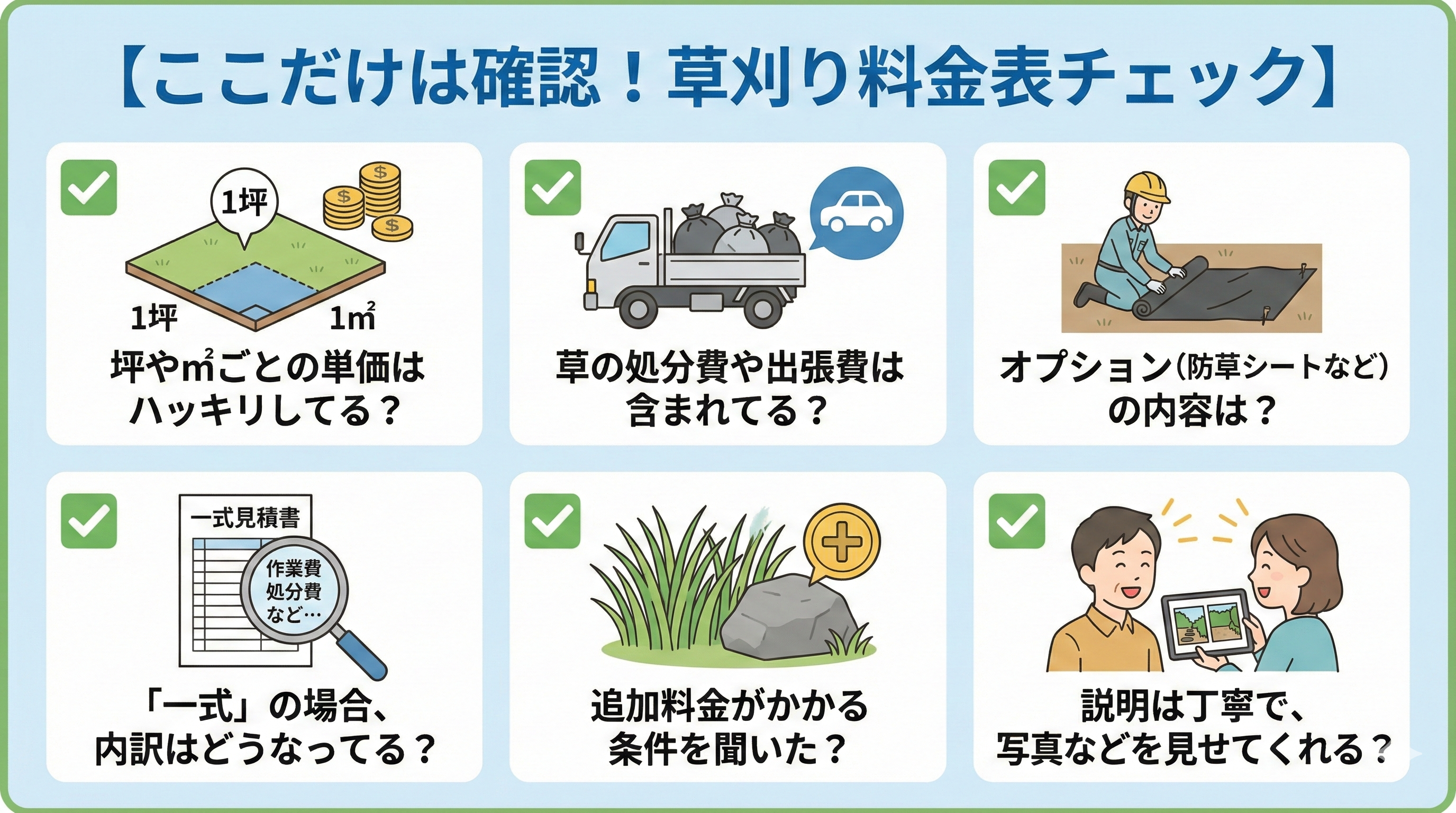 草刈りの料金表は、ただの数字の羅列じゃありません。業者の性格やサービス内容が見えてくる重要な情報源です。 最後に、失敗しないためのチェックポイントをおさらいしましょう!
