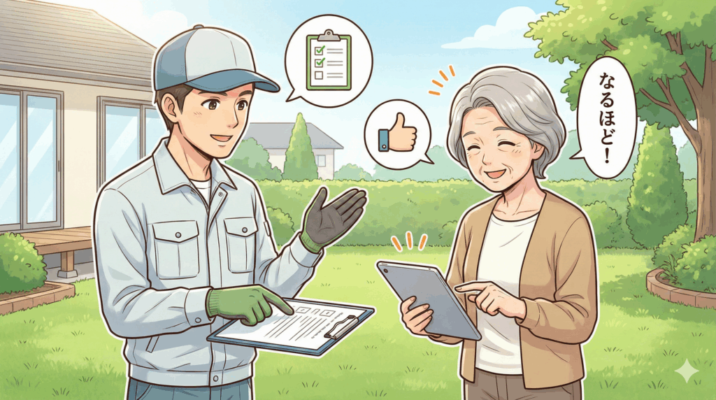 同じ広さでも、草の高さが10cmの庭と、50cmのジャングルのような庭では手間が全然違いますよね。 なので、ちゃんと現場を見て「今の状況だとこの単価になります」と説明してくれるかが重要です。