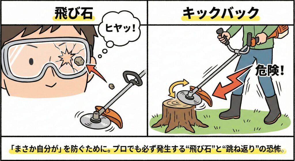 最も多いのが、高速回転する刃が石や空き缶を弾き飛ばす「飛び石」です。しかし、プロが最も恐れるのは「キックバック(跳ね返り)」です。 硬い木や石に刃が当たった瞬間、その反動で草刈り機全体が作業者側に大きく跳ね返る現象で、これにより自分の足を切ったり、転倒したりする事故が後を絶ちません。