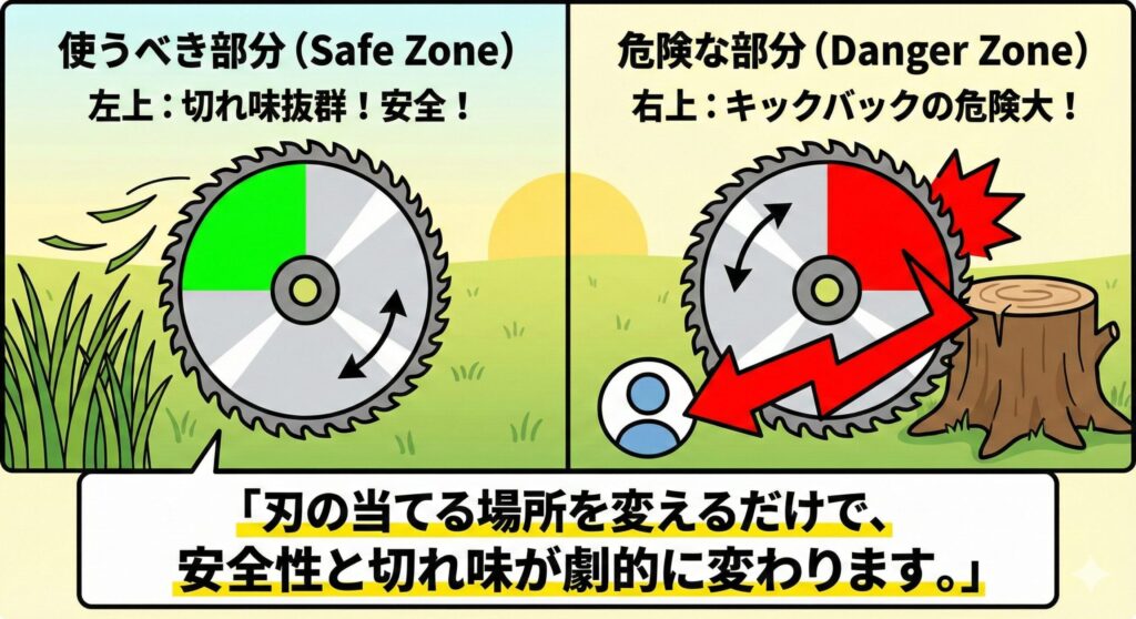 時計の文字盤で例えると、刃の「12時から3時(右上部分)」の範囲を木や石に当てると、強烈なキックバックが発生します。 常に刃の「8時から11時(左上部分)」を当てるように意識することで、跳ね返りを防ぎ、効率よく刈ることができます。