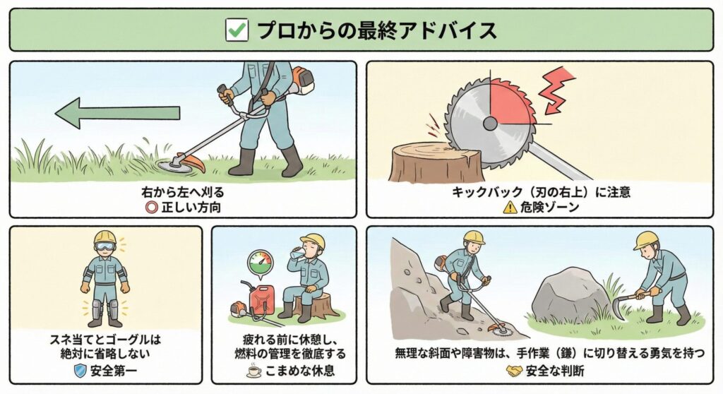 - 無理な斜面や障害物は、手作業(鎌)に切り替える勇気を持つ