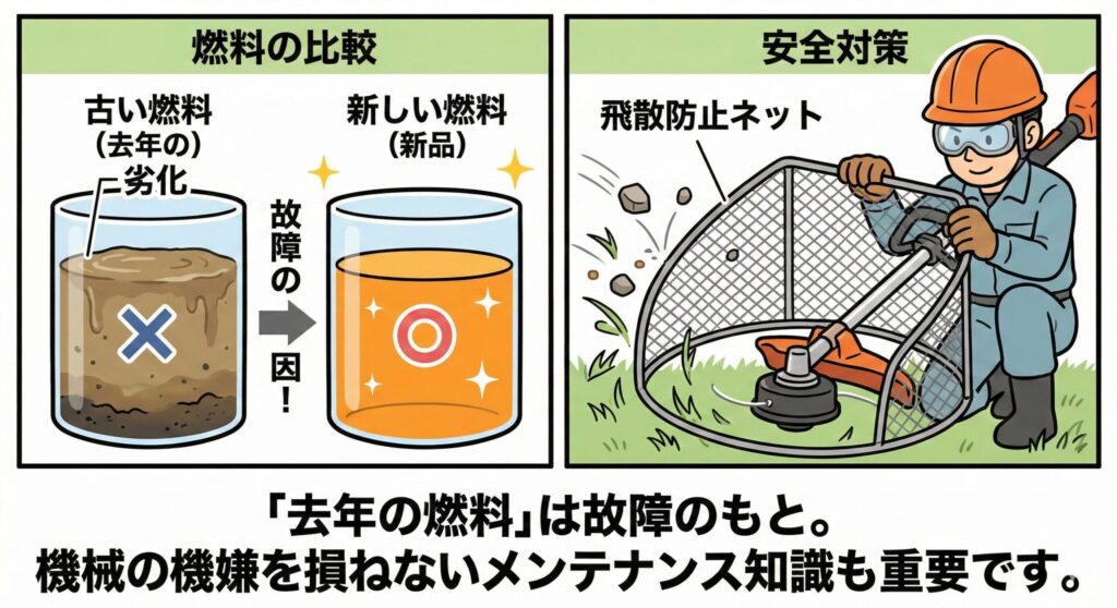 【プロの視点】「混合燃料」の期限 「去年の残った燃料を使ったらエンジンがかからない」は定番のトラブルです。混合燃料(ガソリン+オイル)は作ってから1ヶ月で劣化し始め、キャブレター(燃料供給装置)を詰まらせます。