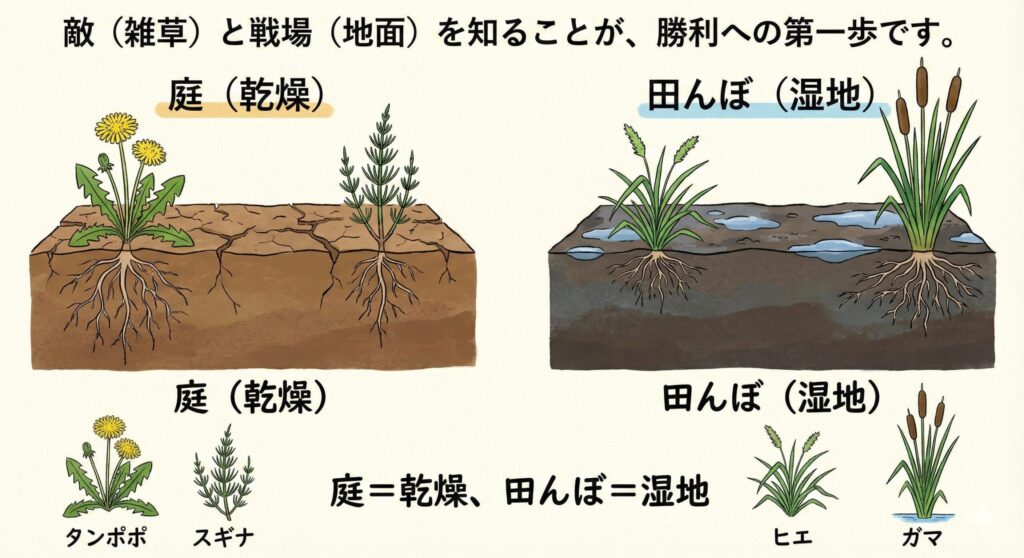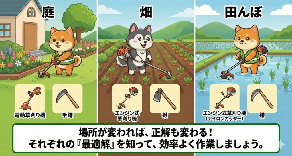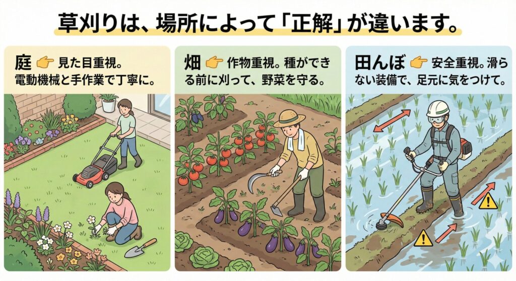 実はそれ、損してるかもしれません。 例えば、お庭では「見た目の美しさ」が大事ですが、畑では「野菜を守ること」、田んぼでは「足場の安全性や水はけ」が最優先になります。 場所によって、道具もタイミングも全然違うんです。