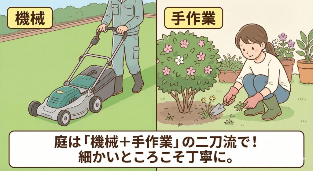 - 庭 ➡️ 見た目重視。電動機械と手作業で丁寧に。