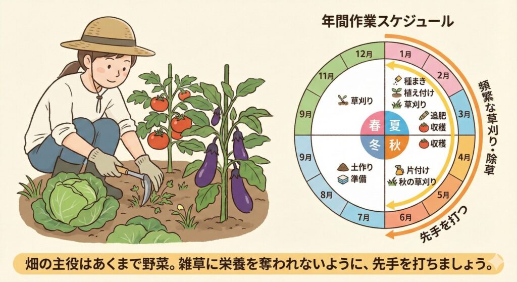 畑での草刈りは、作物を元気に育てることが目的です。 「全部きれいに刈る」ことよりも、「野菜の邪魔をさせない」ことが大事です。