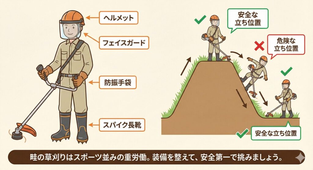 地面のコンディションも、「庭は平らだけど、田んぼはドロドロで滑る」といった違いがありますよね。 だからこそ、場所に合わせて道具ややり方を変えるのが、一番の近道なんです。