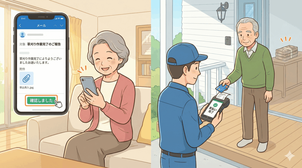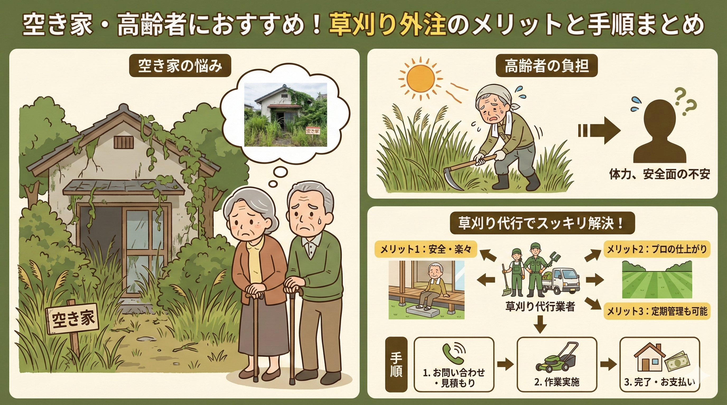 草刈り代行サービスは、高齢者の方や遠方の空き家所有者にとって、安全・効率・美観のすべてを叶える強力な味方なんです。