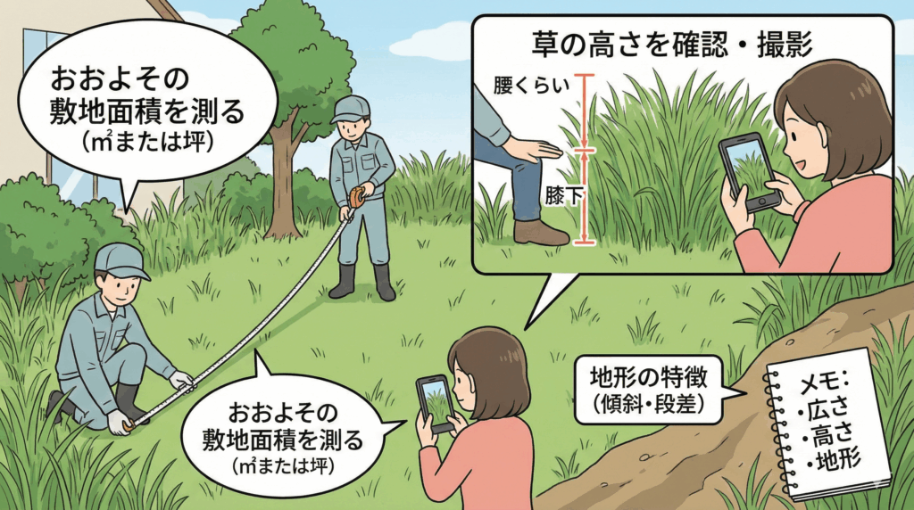 多くの業者は、実際の現場を見たうえで見積もりを出してくれます。草の状態、土地の形、障害物の有無なんかをチェックされるんですよ。ここで希望内容や作業条件も伝えておくと安心です。
