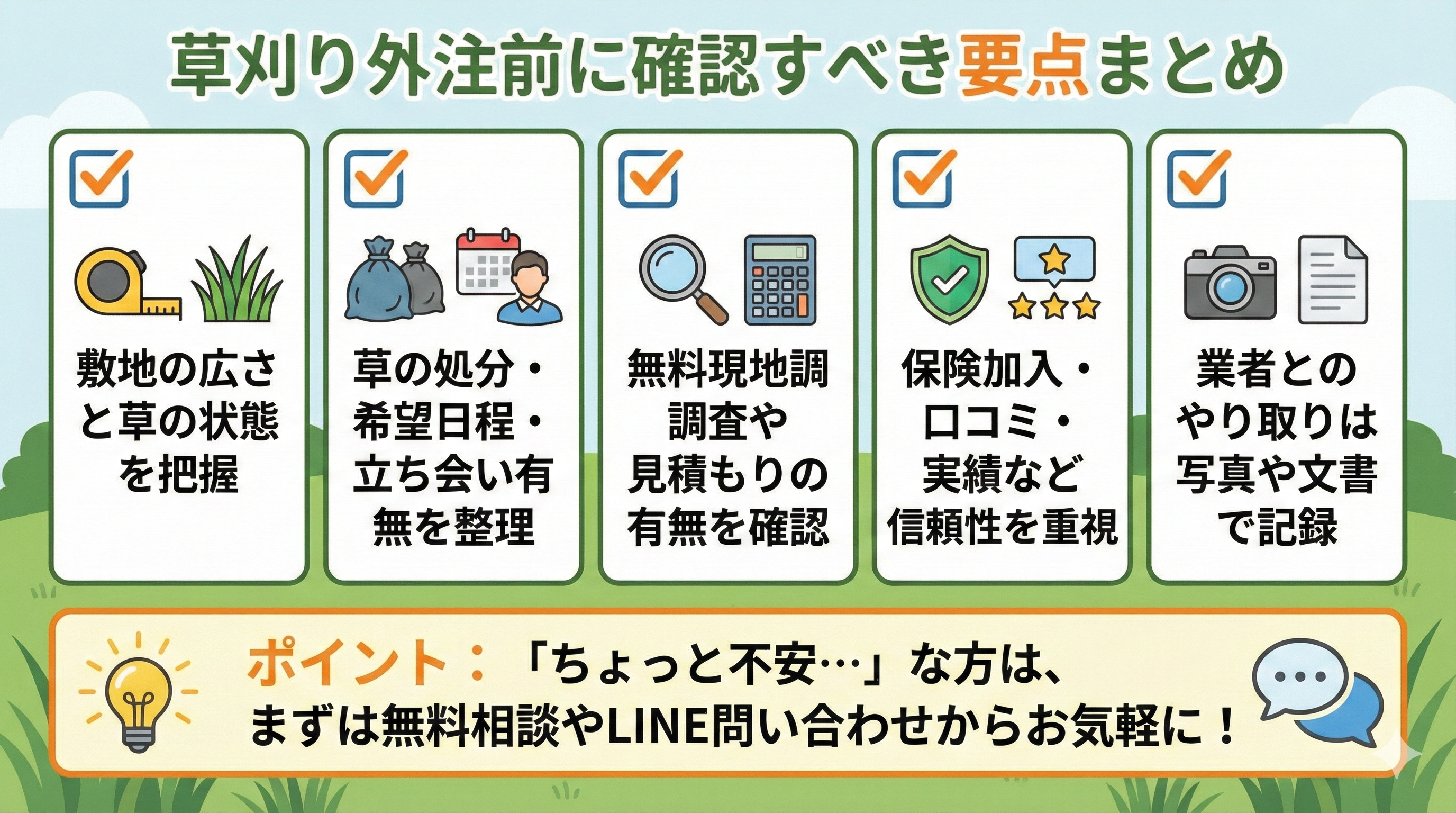 草刈り代行サービスをスムーズに利用するには、依頼前にいくつかのポイントを確認しておくことが大切なんですよね。事前準備をしっかり行えば、見積もりの精度も高まって、不要なトラブルや追加費用を避けることができます。