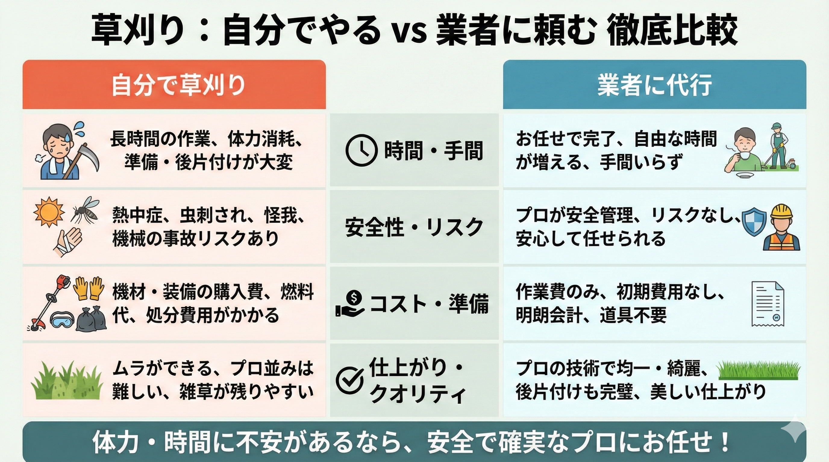 この記事を参考に、あなたにぴったりの草刈り代行業者と出会って、安心して依頼できる環境を整えてくださいね。