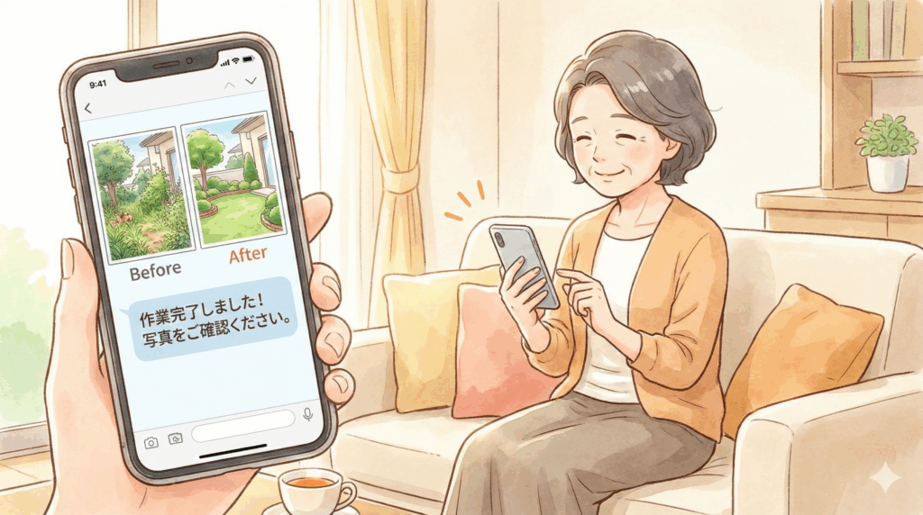 遠くの実家や空き家など、なかなか行けない場所の管理も悩みどころ。 今は、作業前後の写真を送って報告してくれる業者さんも多いです。見積もりから報告までスマホひとつで完結できるところを選べば、遠くにいても安心してお任せできますよ📱