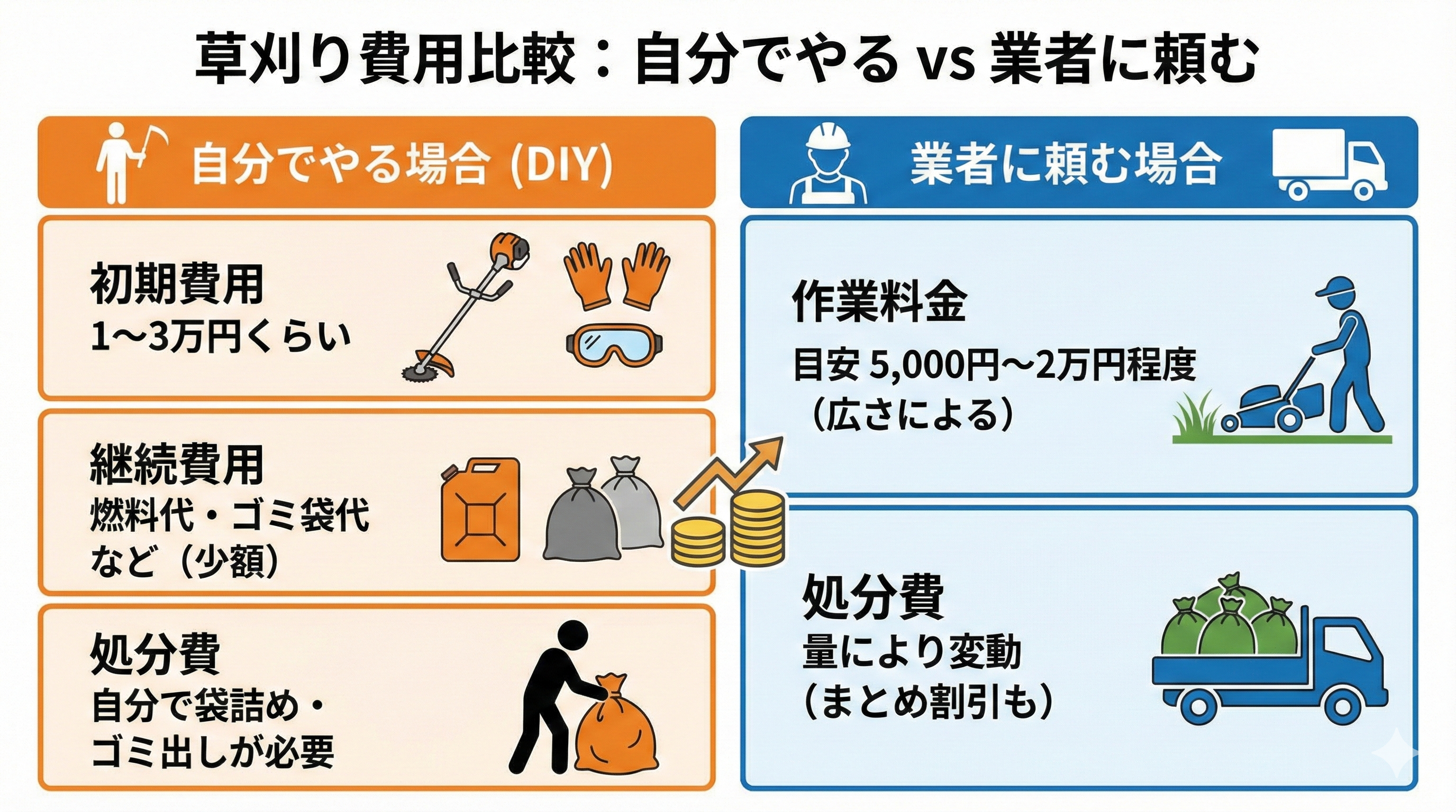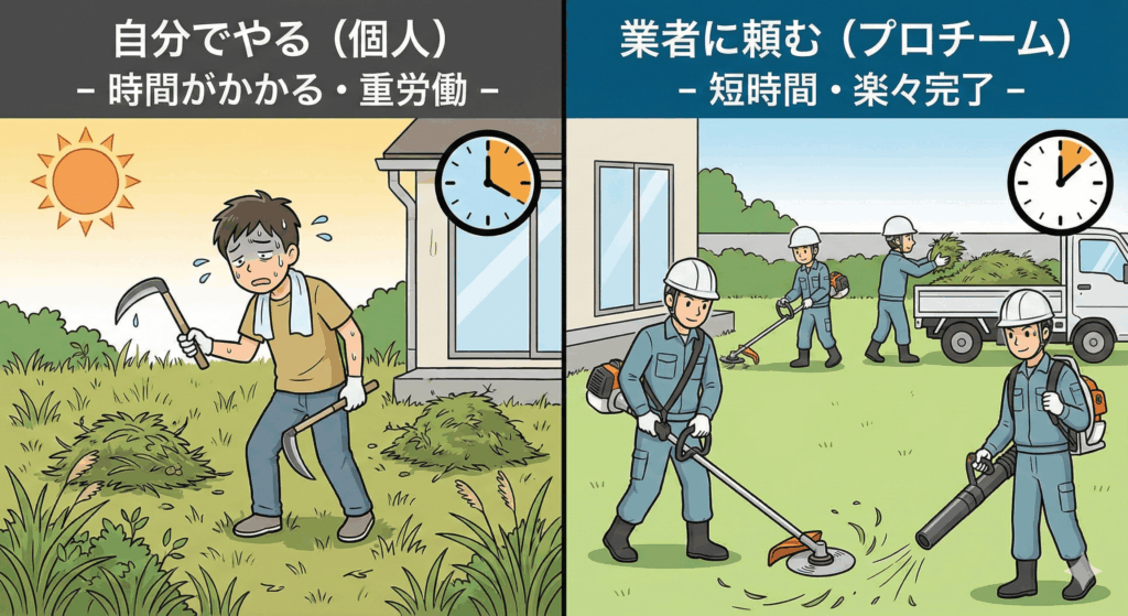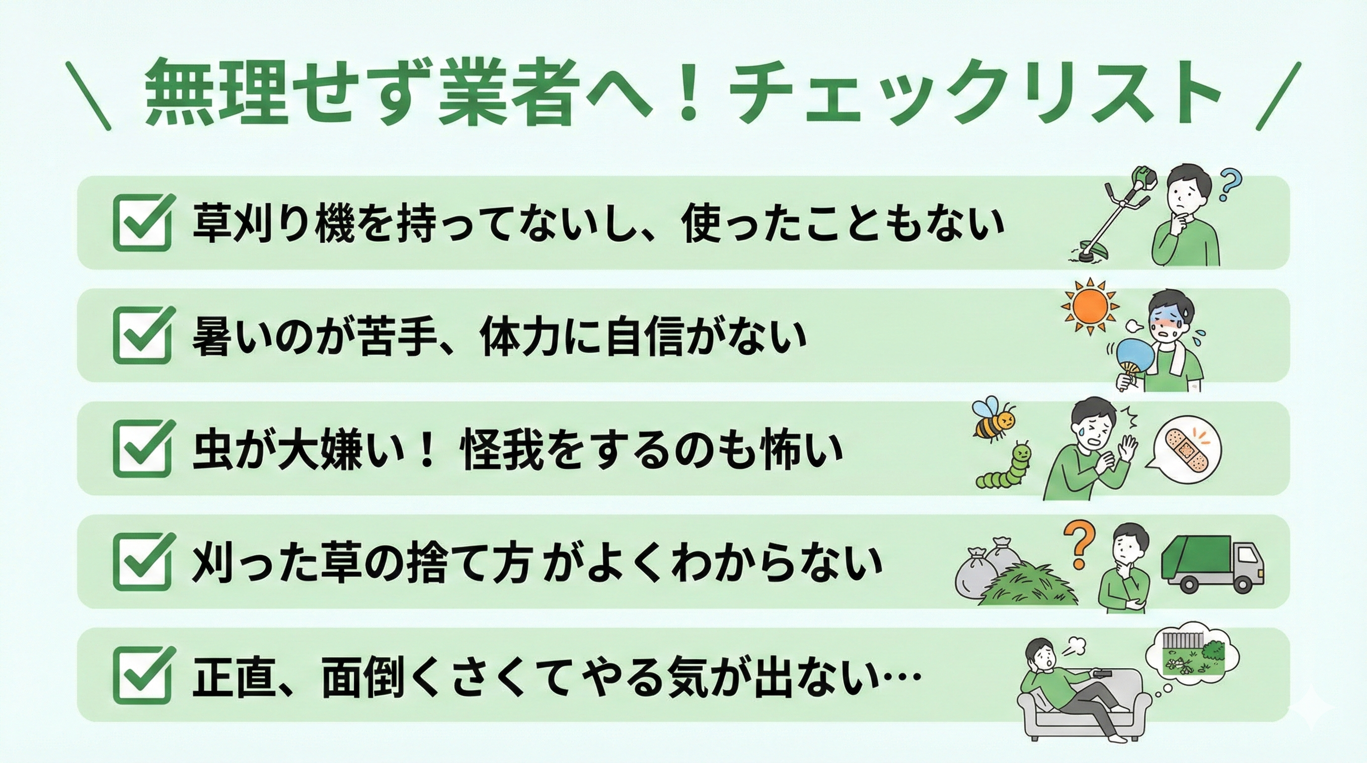 草刈りは「体力・道具・時間・安全性」をトータルで考えて、「自分でやるか、頼むか」を決めるのがポイントです。