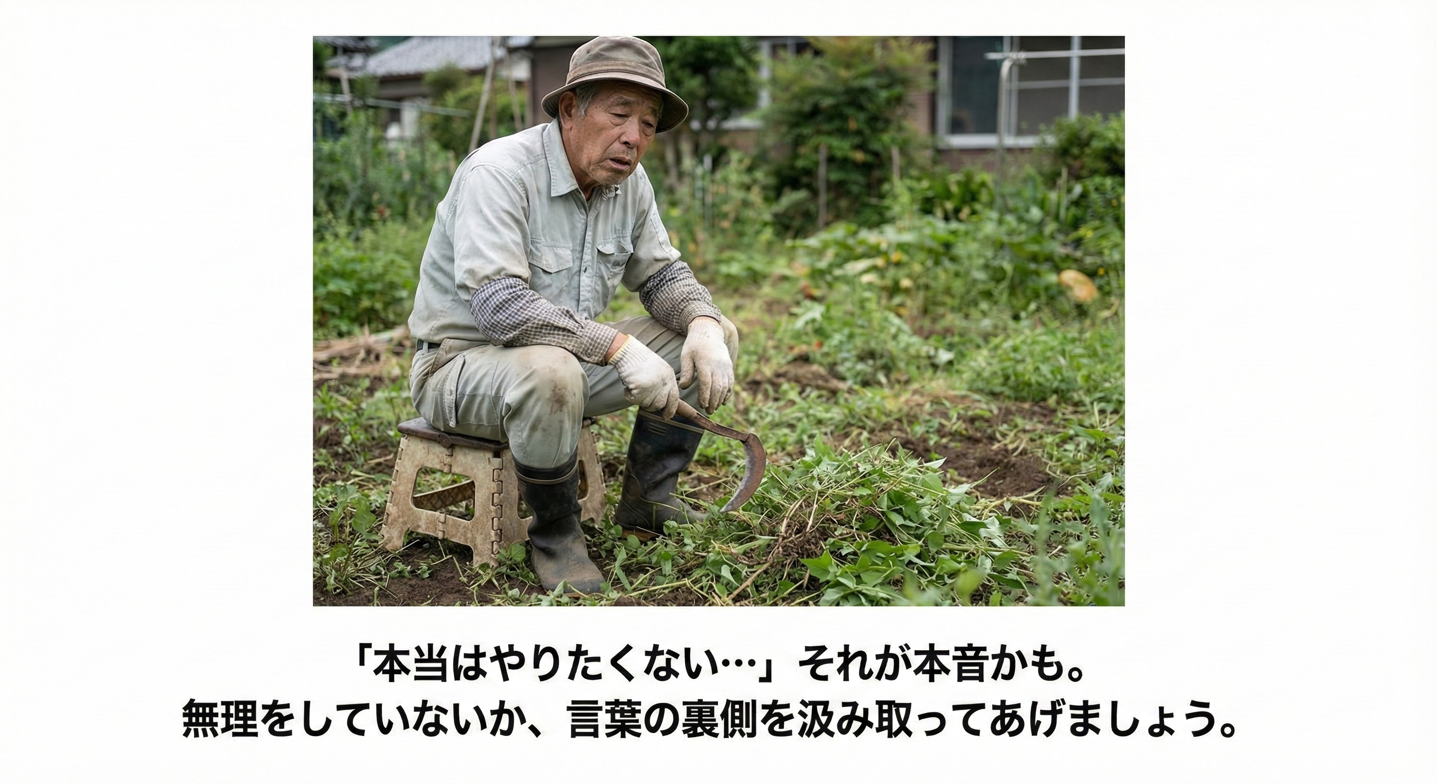 心の奥底では、「本当は暑くてしんどい」「腰も痛いし、誰か代わりにやってくれないかな…」という葛藤を抱えている方がほとんどなんです。