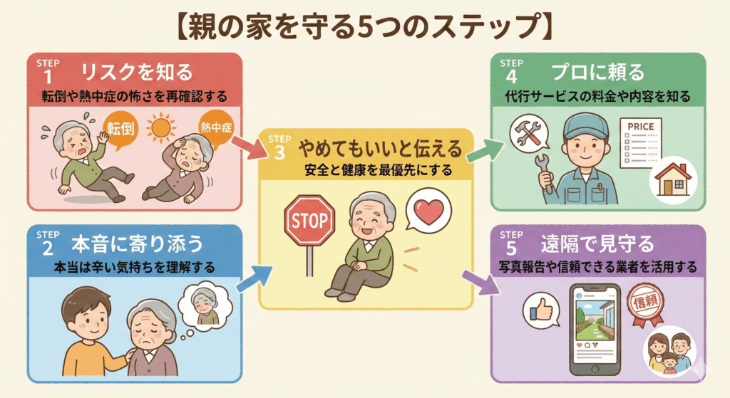 この記事では、高齢の親が草刈りをすることのリスクと、それを安全に代行サービスへ切り替えるための「5つのステップ」をご紹介します。