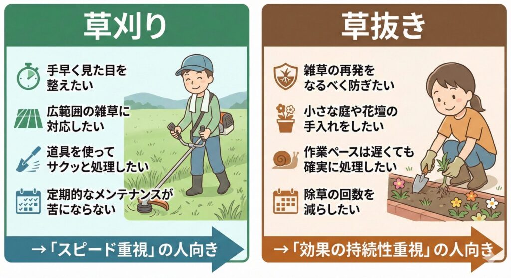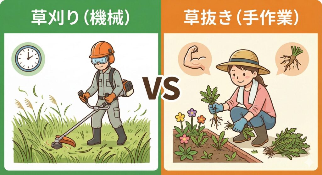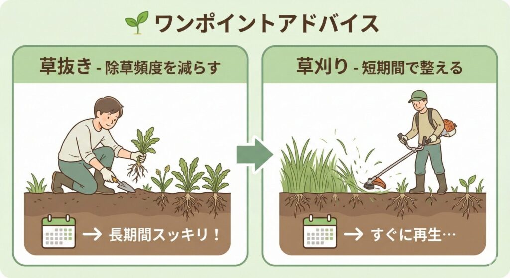 | 広い庭・空き地 | 草刈り → 後日草抜き | まず草刈りで全体を整え、必要な場所だけ草抜きで根から除去 |