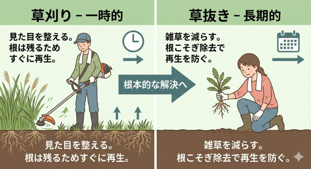草刈りは「一時的に見た目を整える」ための方法、草抜きは「長期的に雑草を減らす」ための方法といえます。