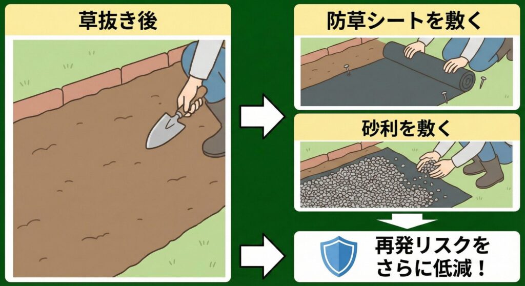 補足ですが、防草シートとの併用もおすすめです。草抜き後に防草シートや砂利を敷くことで、再発リスクをさらに低減できます。