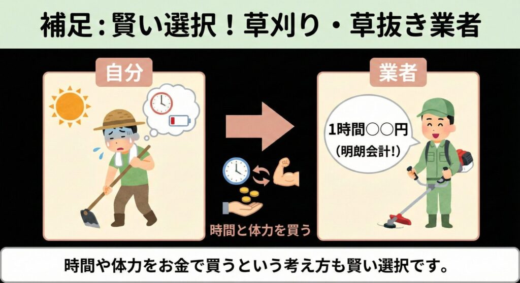 最近では「1時間◯◯円」など、明朗会計の草刈り・草抜き業者も増えています。時間や体力をお金で買うという考え方も賢い選択です。
