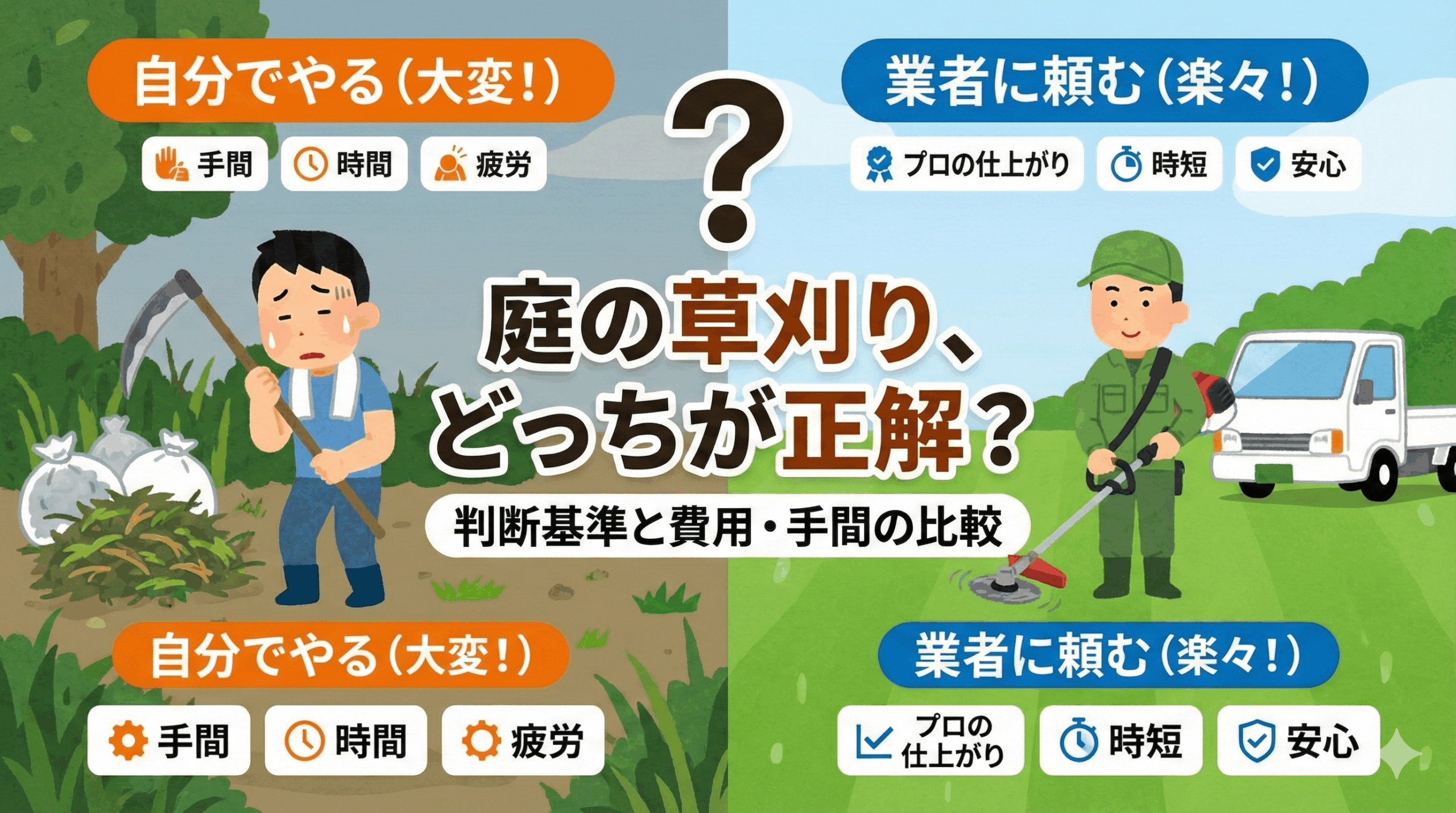 庭の草刈り、業者に頼む?自分でやる?判断基準と費用・手間の比較