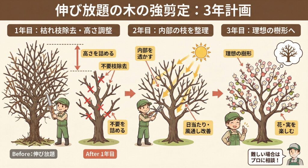 1年目は、枯れ枝や明らかな不要枝を取り除き、高さを詰める程度に留めます。2年目、3年目で徐々に内部の枝を整理し、理想の樹形に近づけていきましょう。自分で判断するのが難しい場合は、一度プロの造園業者に相談することをおすすめします。
