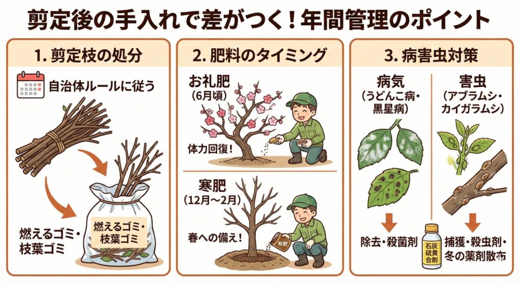剪定は切って終わりではありません。その後の手入れが、翌年の花つきや木の健康を大きく左右します。