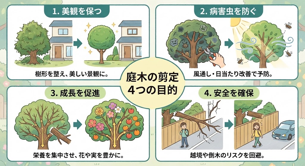 庭木の剪定は、単に見た目を整えるためだけではありません。樹木の健康を保ち、安全を確保するためにも非常に重要な作業です。まずは、剪定が持つ4つの大切な目的を理解しましょう。