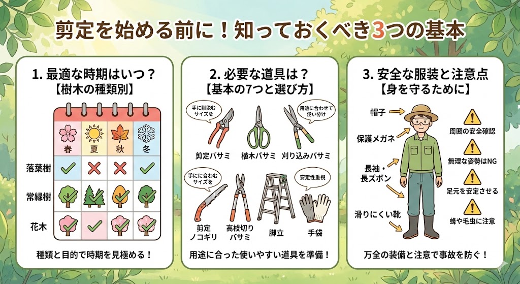 剪定の目的を理解したら、いよいよ準備です。しかし、いきなり枝を切り始めるのは絶対にやめましょう。剪定で失敗しないためには、「時期」「道具」「安全対策」という3つの基本を事前にしっかりと押さえることが何よりも大切です。