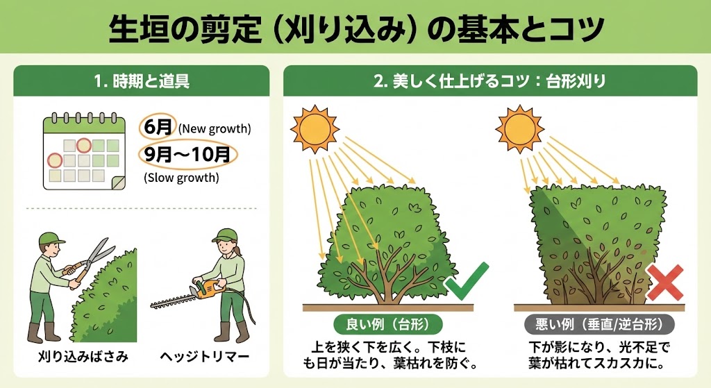時期は年に2回、新芽が伸びる6月頃と、成長が緩やかになる9月~10月頃が一般的です。道具は、広い面を一度に刈れる「刈り込みばさみ」や、電動の「ヘッジトリマー」を使います。 - 美しく仕上げるコツ(上部を狭く、下部を広く)