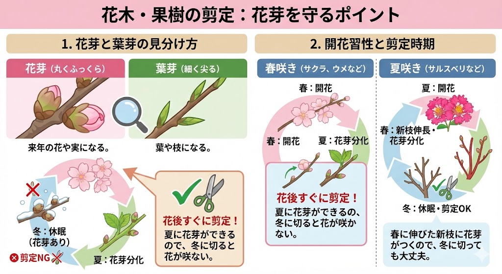 一般的に、花芽は丸くふっくらしており、葉芽は細く尖っています。剪定前に花芽がどこに付いているかを確認しましょう。 - 開花習性に合わせた剪定時期の考え方