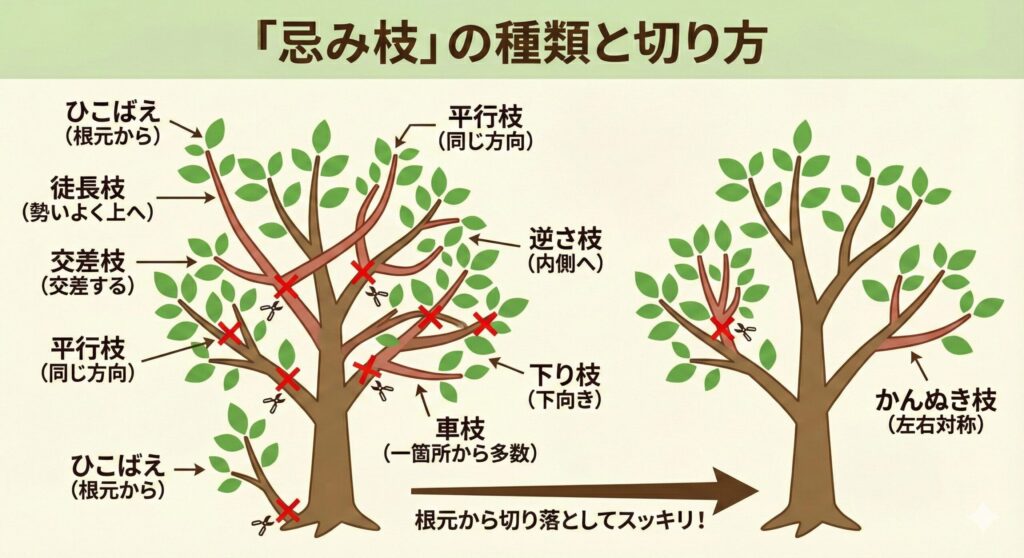 木の健康を害したり、美しい樹形を乱したりする枝を「忌み枝(いみえだ)」と呼びます。剪定は、まずこれらの不要な枝を取り除くことから始めます。
