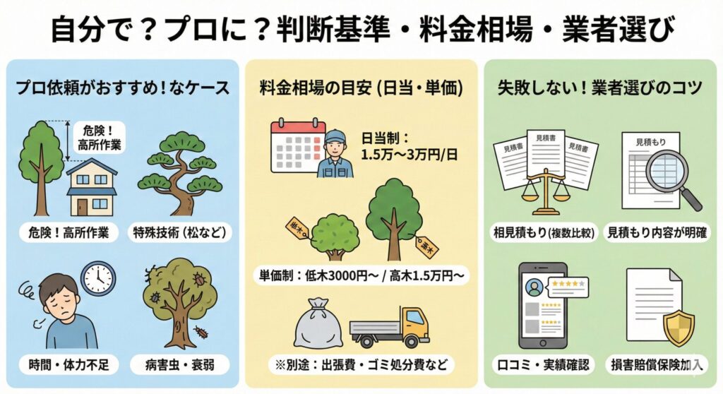 - 困ったらプロに相談:高木や特殊な木の剪定、時間がない場合は無理せず専門業者に依頼する。