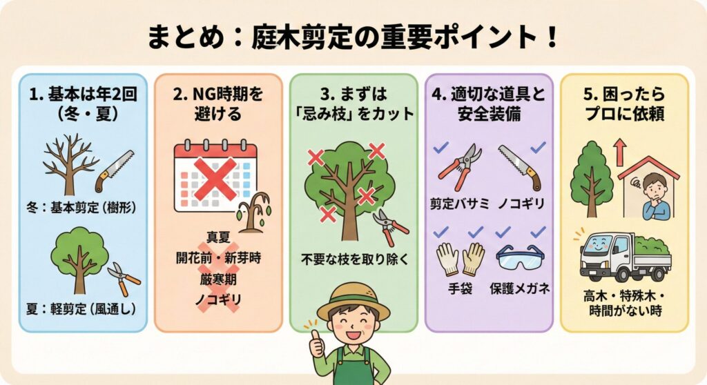 今回は、庭木の剪定時期と初心者でも失敗しない方法について詳しく解説しました。最後に、この記事の重要なポイントを振り返りましょう。