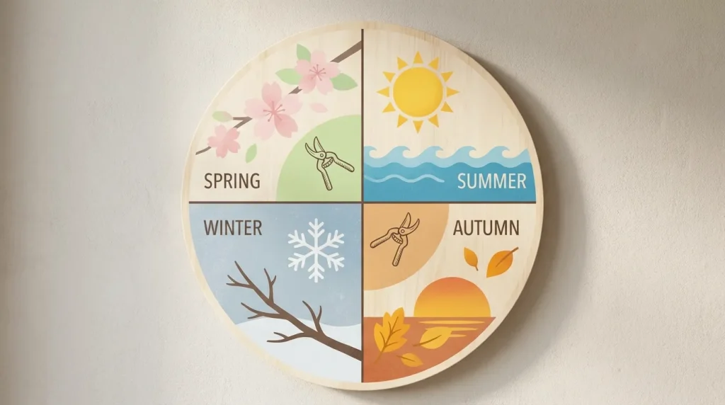 • 秋(9月〜11月):夏の成長が一段落し、冬の休眠に入る前の時期です。夏の間に伸びすぎた枝を整理し、冬に向けて樹形を整えるのに適しています。